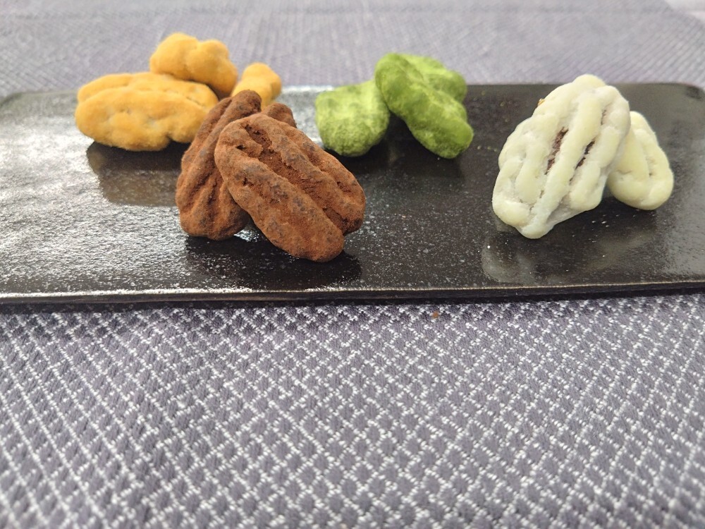 ペカンナッツをホワイトチョコレートとキャラメルパウダーで包みました。ナッツの香ばしさと、ほろ苦いキャラメルの相性は抜群です。