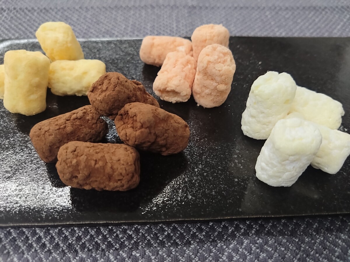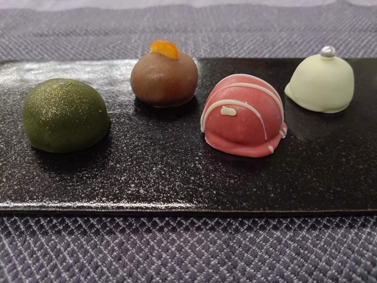 マシュマロを、ホワイトチョコレートと粉砂糖で包みました。濃いめの緑茶と一緒に、ふわっと溶けるような口当たりはいかがでしょう。