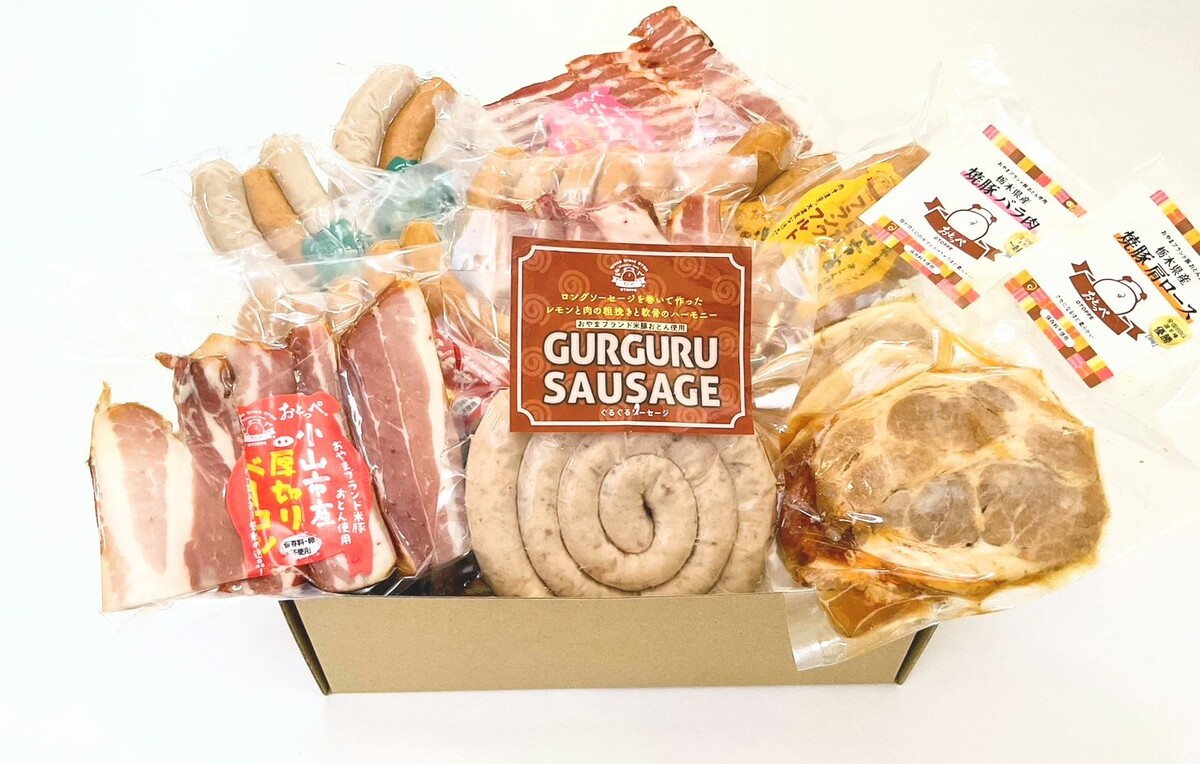 12個入り(ぐるぐる生ソーセージ、厚切りベーコン×2、あらびきフランク×2、ビアフレンズ×2、スライスベーコン、あらびきソーセージ×2、チャーシュー肩ロース、チャーシューバラ肉)