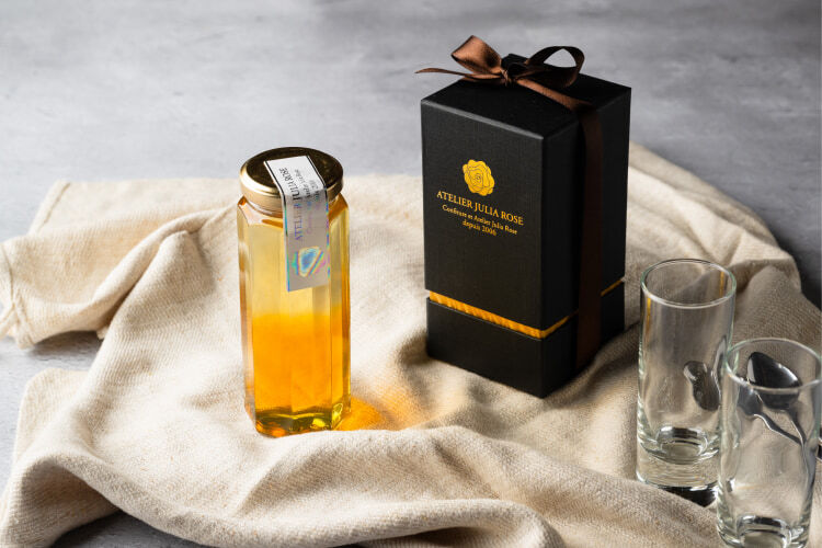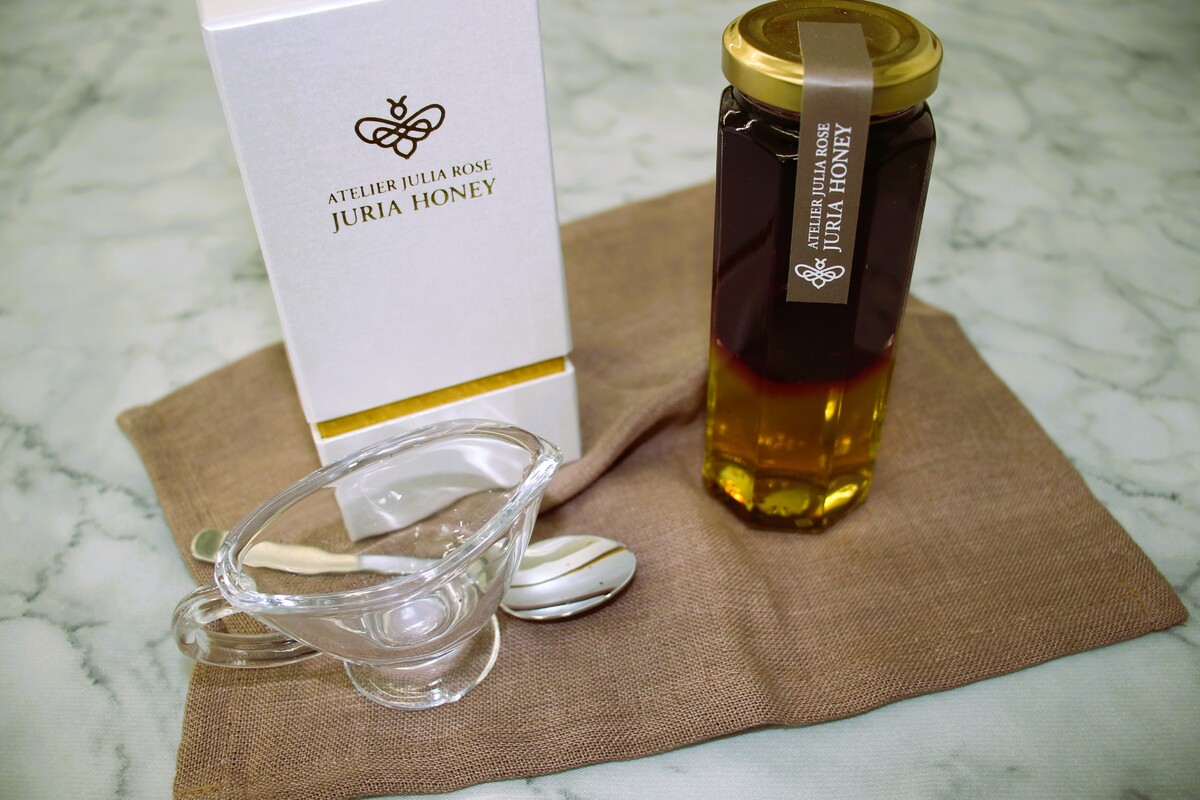 アトリエ・ジュリアローズでは、はちみつは花と蜂たちの営みによって生まれた究極の花のジャムと捉え、混ぜ物の一切ない100%国産のはちみつを使用しています。